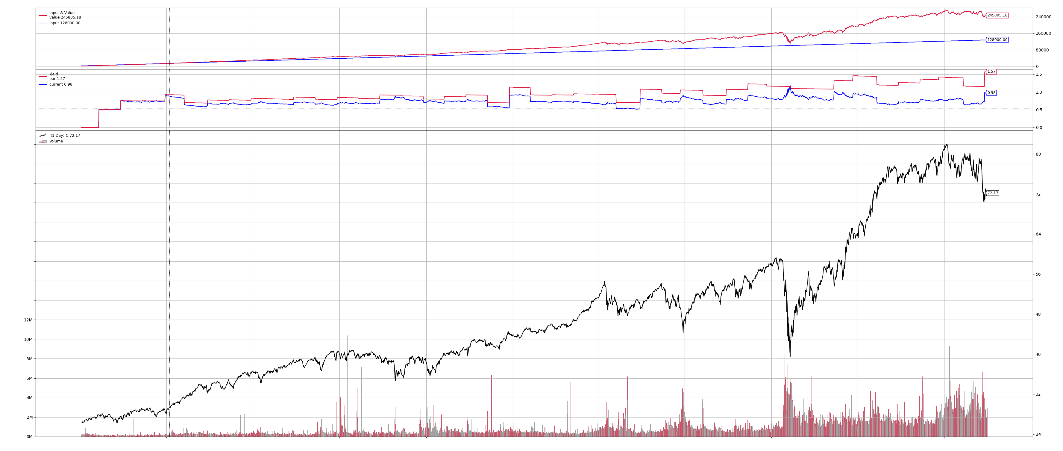 10년6개월 투자대비 대략 63% 수익율을 보이고 있습니다. 배당재투자를 빼니 역시 SPY보다 조금 낮네요