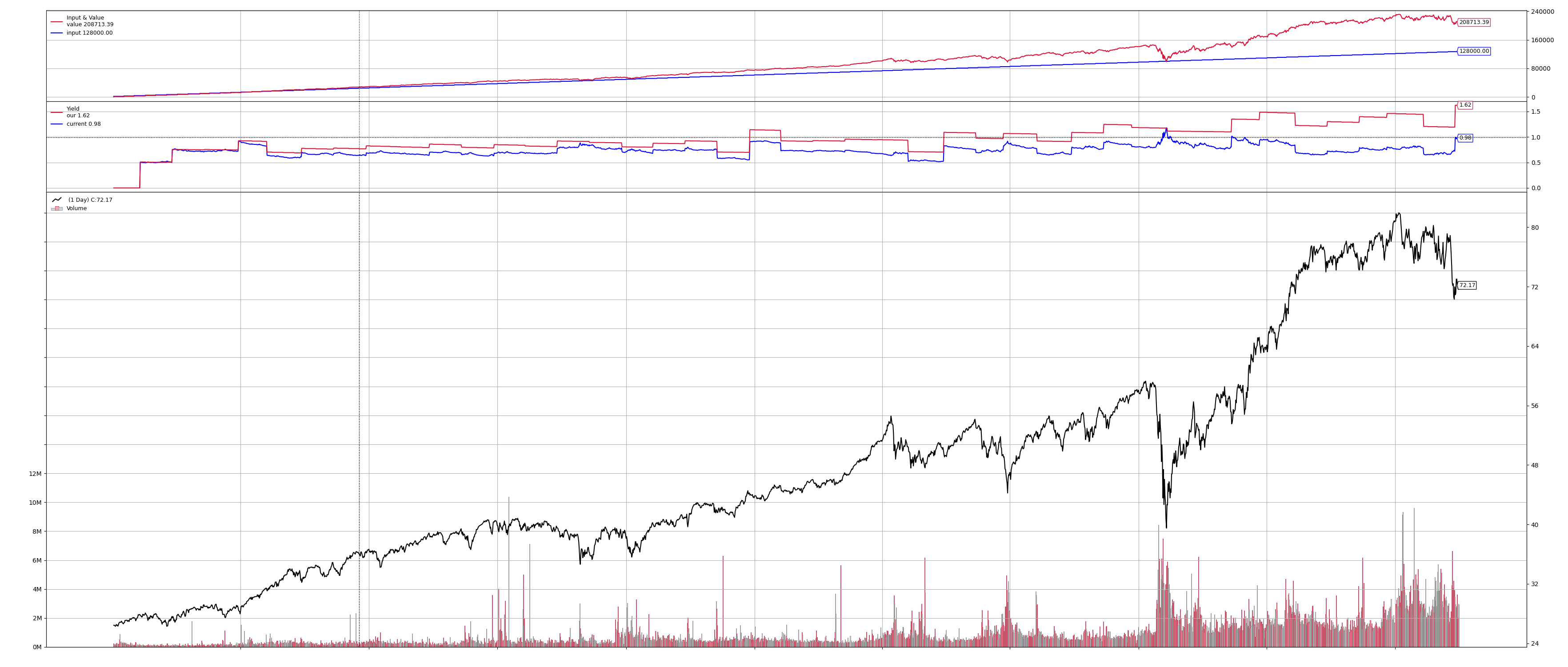 SPY는 분기배당이므로 연배당율을 유추하면 시가배당율 3.92%, 투자배당율 6.28% 입니다.