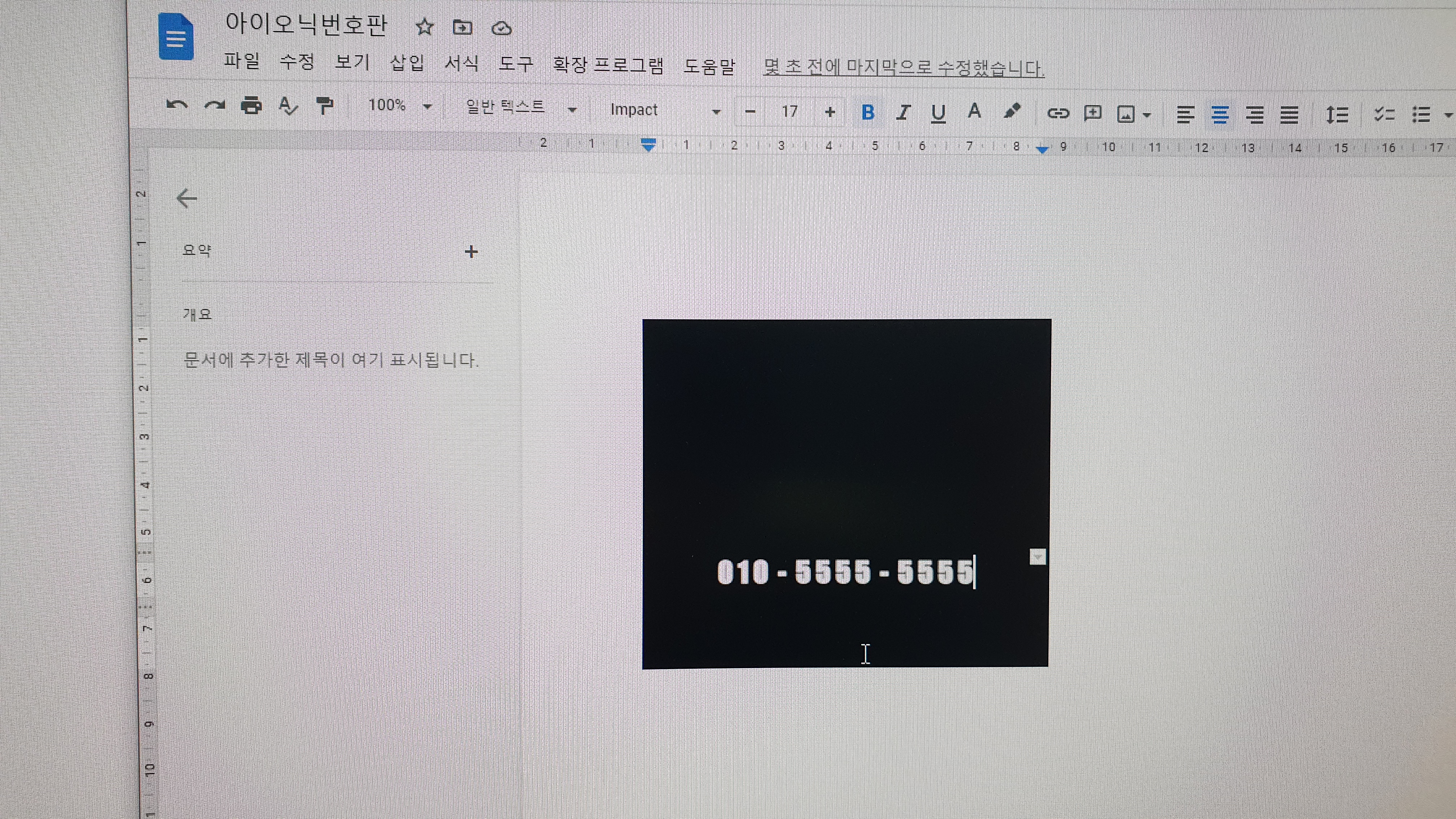 구글워드를 이용해서 만들었습니다. 왼쪽과 위쪽 자를 보시고 사이즈 참고 하시면 됩니다. 폰트는 Impact 17 사이즈 이고, 숫자 사이에 공백한칸씩 - 양쪽은 공백두칸입니다. 저는 그냥 검은색바탕에 흰색글씨로 했어요