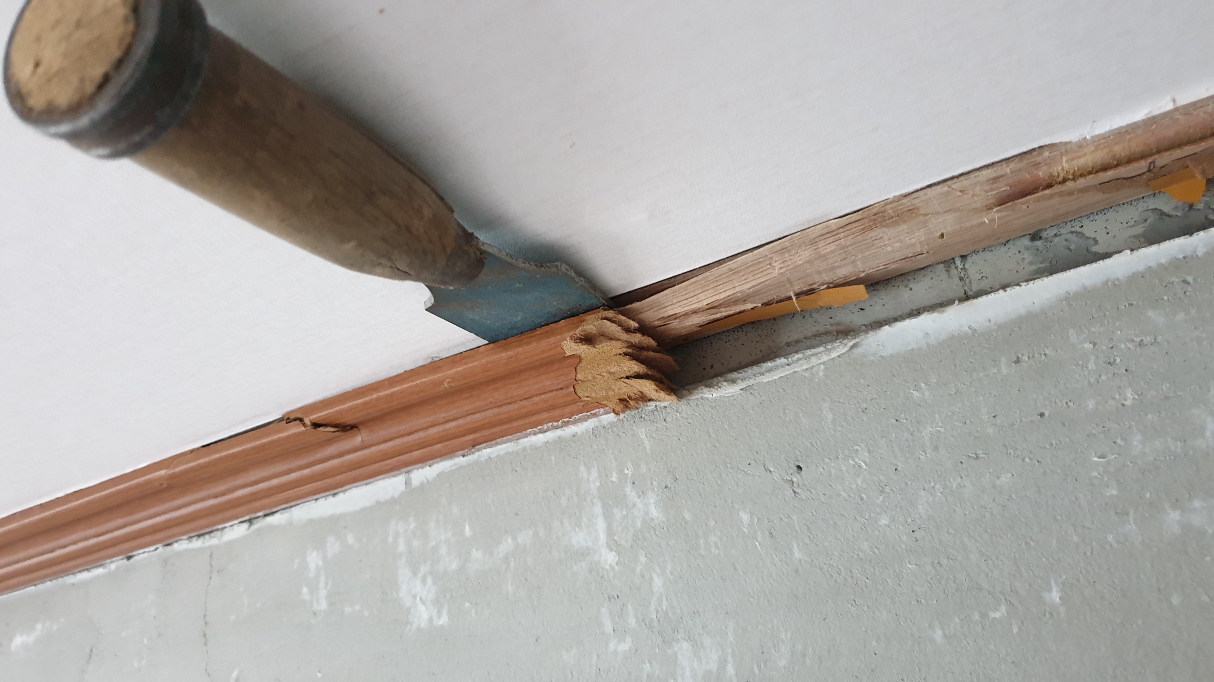 - 일반적으로 몰딩은 본드와 작은 타카핀으로 고정되어 있어 끌등으로 틈새에 집어 넣어 우지끈 당기면 떨어지는데...... 이게 아무리 해도 떨어지지 않는 상황이;;;