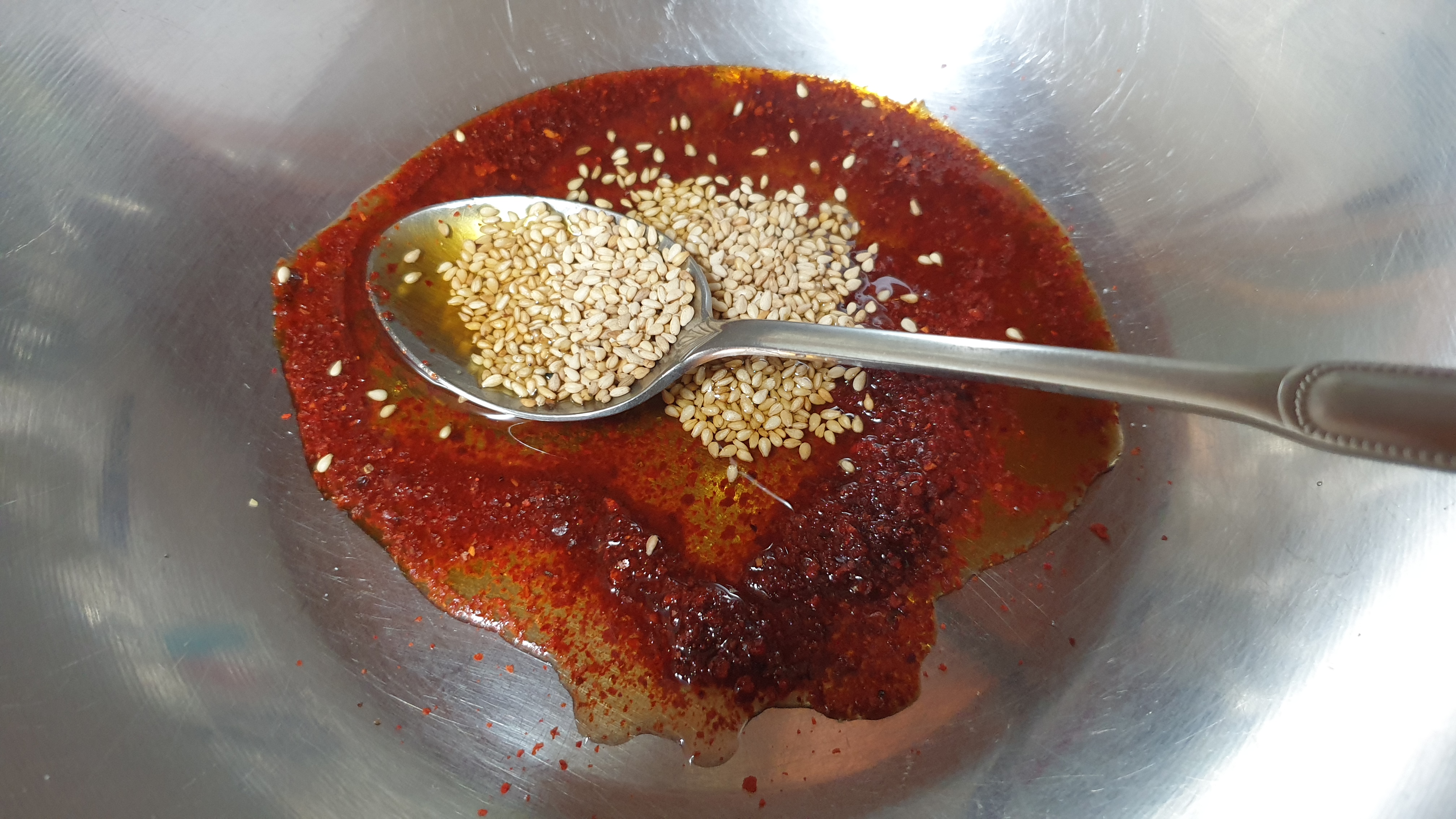 간장 2수저, 고추가루 2수저, 설탕 0.5수저, 매실액 1수저, 식초 1수저, 참기름 1수저, 통깨 2수저