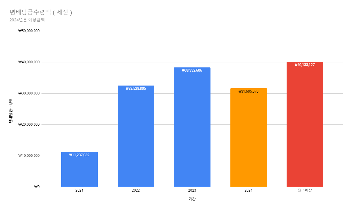- 2021~2023년년도별 배당금 실수령액과 2024년 예상 배당금수령액입니다.