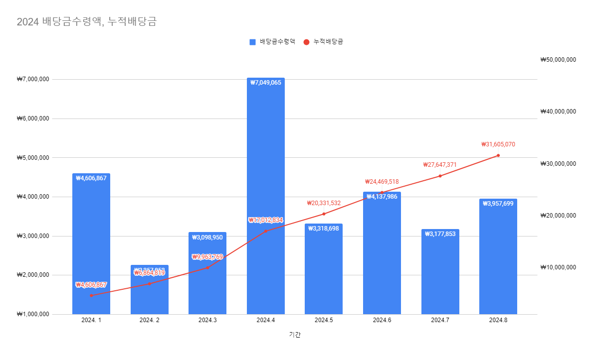 - 세전 3,957,699원 수령하였습니다. 누적배당금은 31,605,070원입니다.