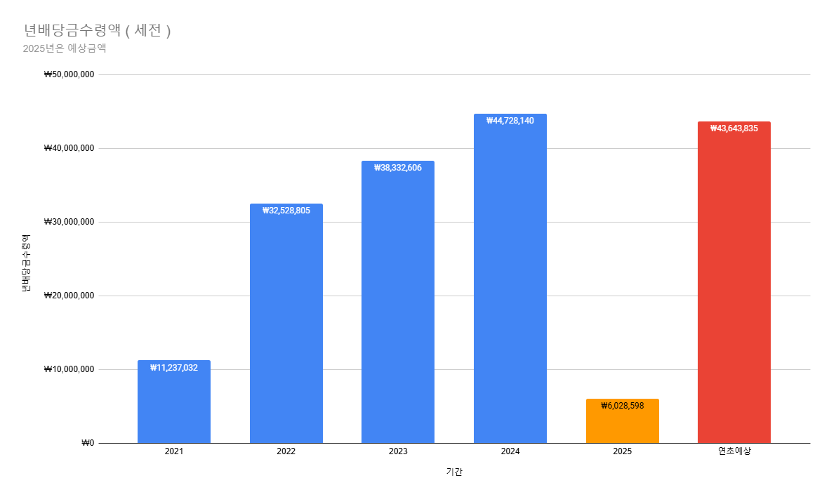 - 2021~2024년년도별 배당금 실수령액과 2025년 예상 배당금수령액입니다.