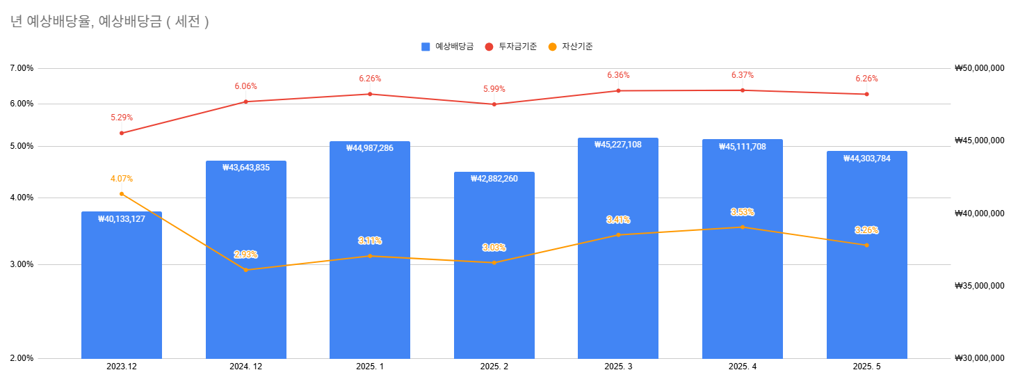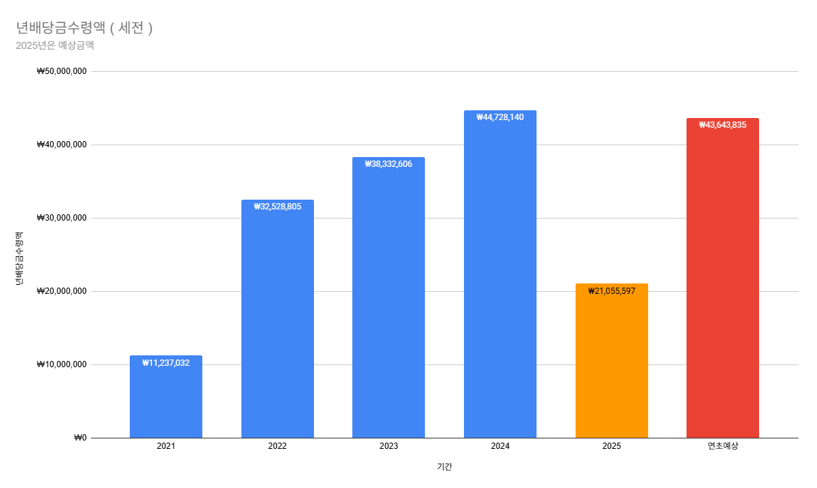 - 2021~2024년년도별 배당금 실수령액과 2025년 예상 배당금수령액입니다.