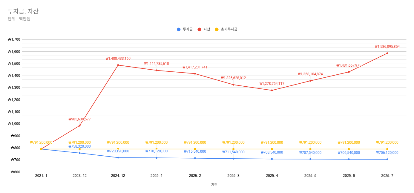 - 2025.8.1일 기준 평가금액은 1,586,895,854원 입니다.