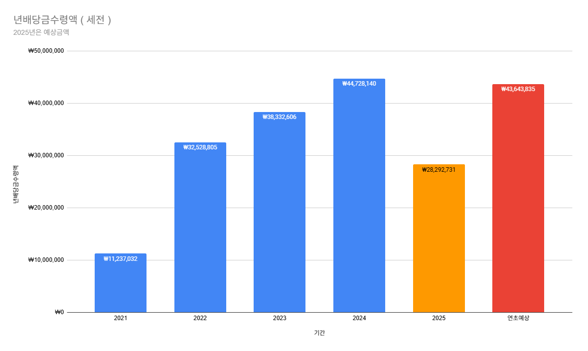 - 2021~2024년년도별 배당금 실수령액과 2025년 예상 배당금수령액입니다.